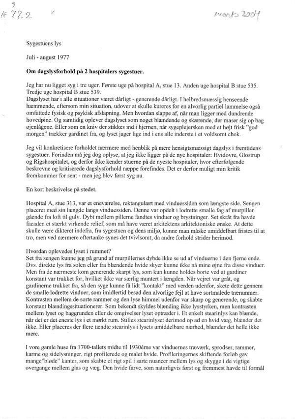 Om dagslysforhold på 2 hospitalers sygestuer juli-aug 1977
