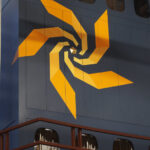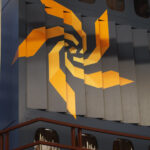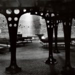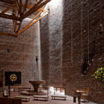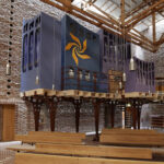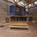 Indgangen til rummet sker gennem en “skov” af buede stålsøjler, der bærer orgelpulpituret.