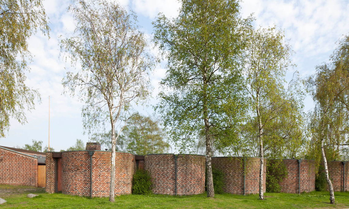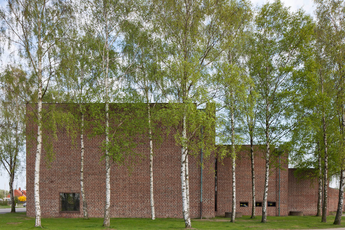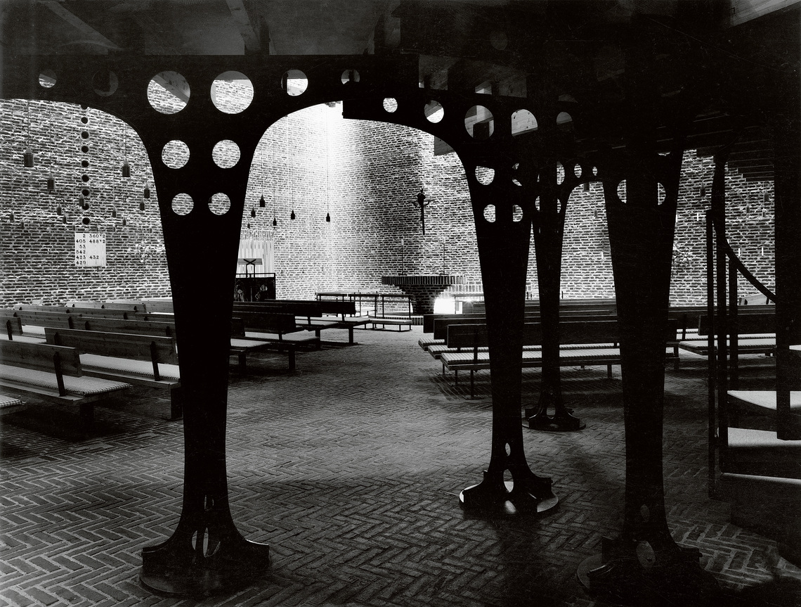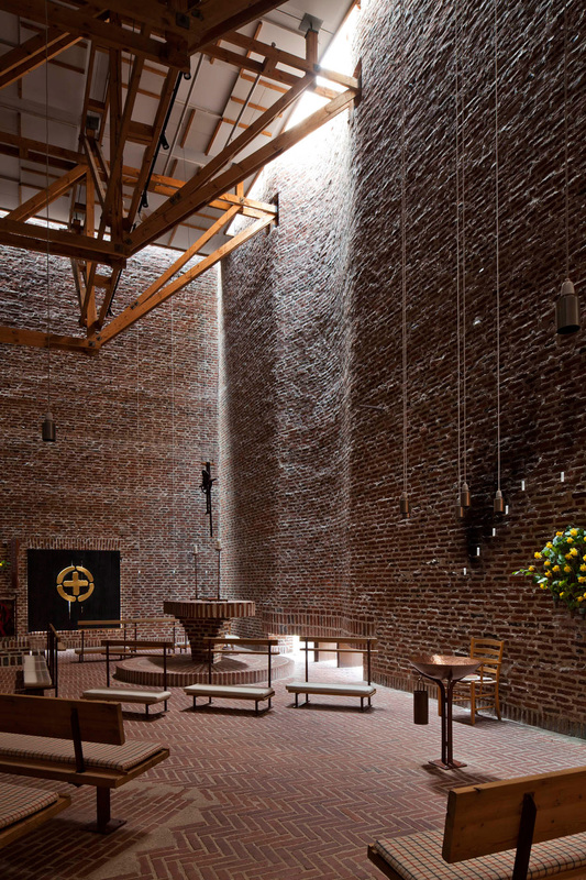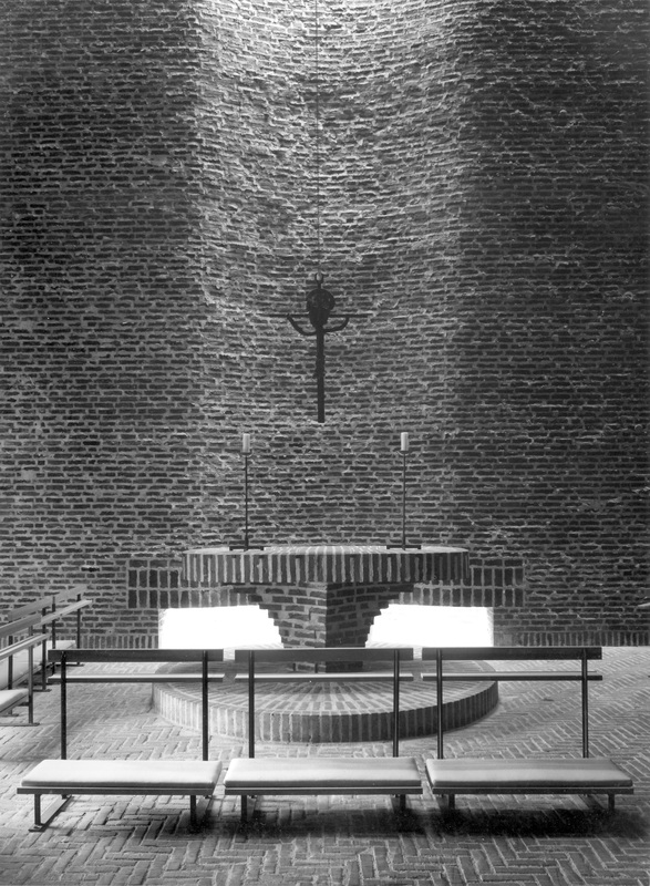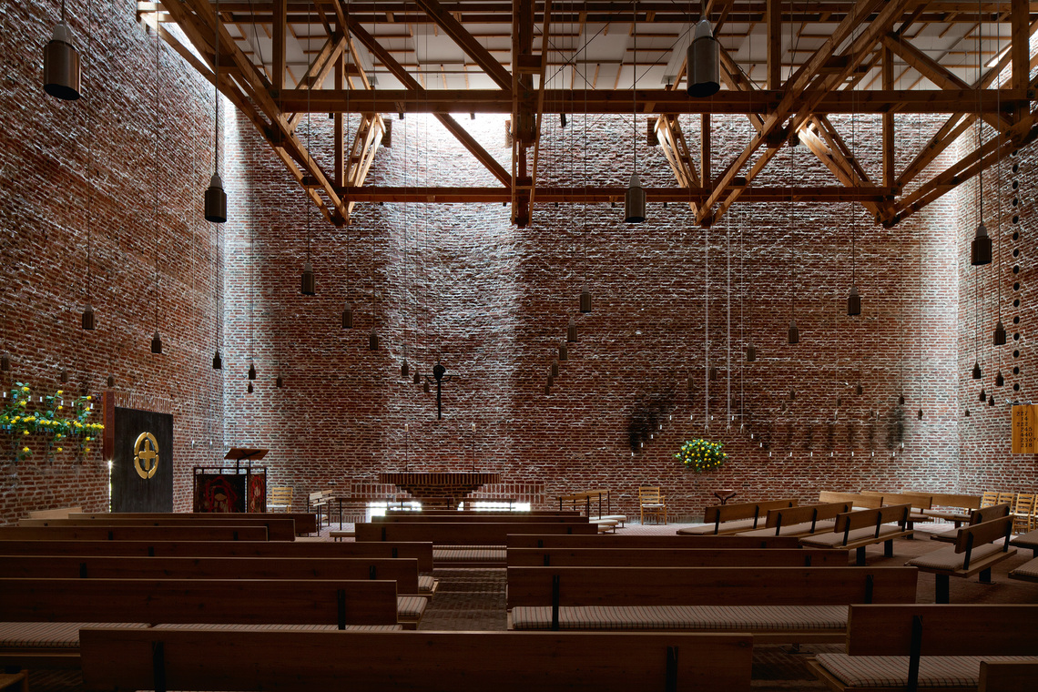 Det ses bl.a. i apsisbuens beherskede krumning og sarte lys bag alteret. Den store retningsløse loftskonstruktion, der bærer taget, understreger rummets individuelle karakter.