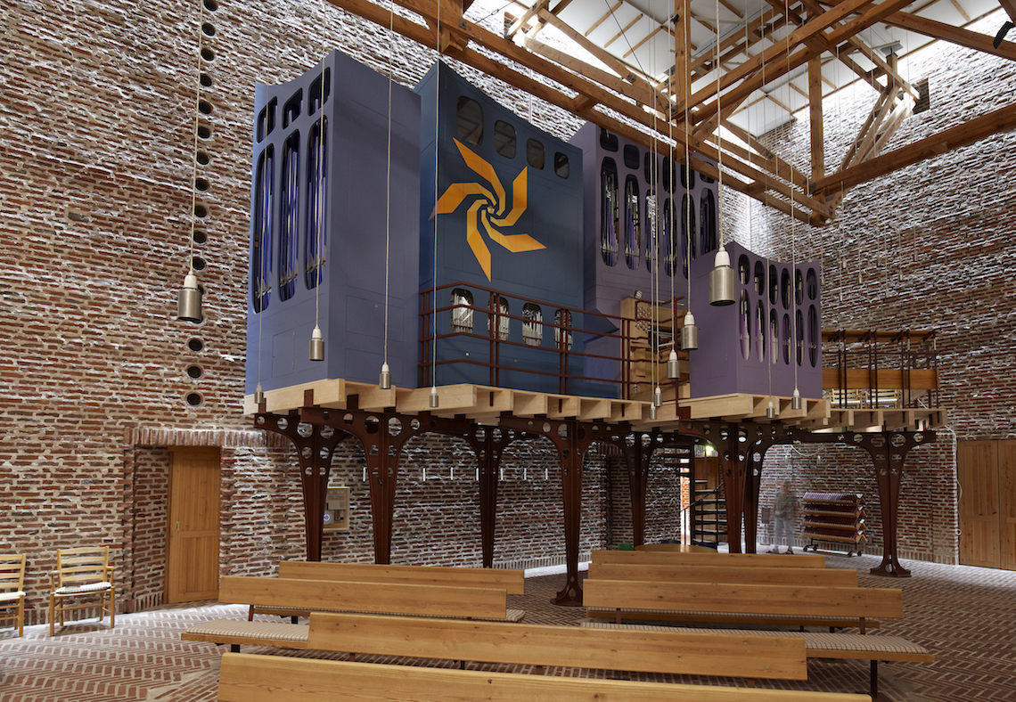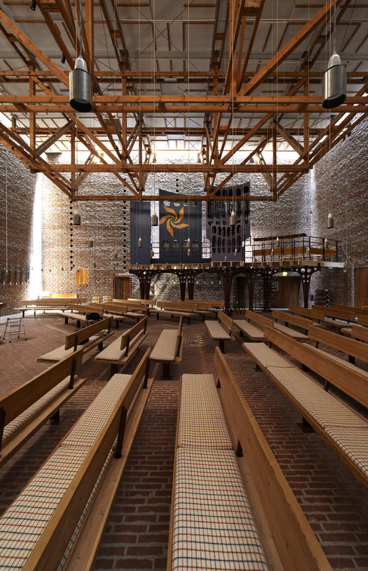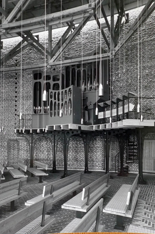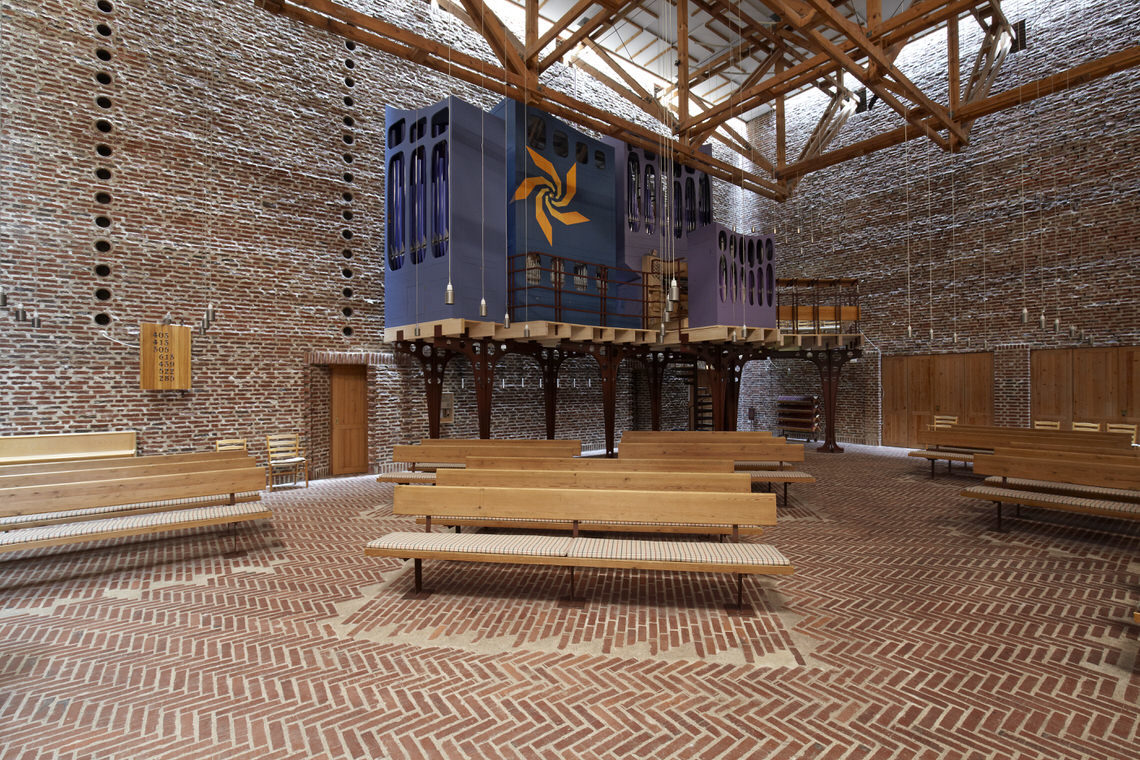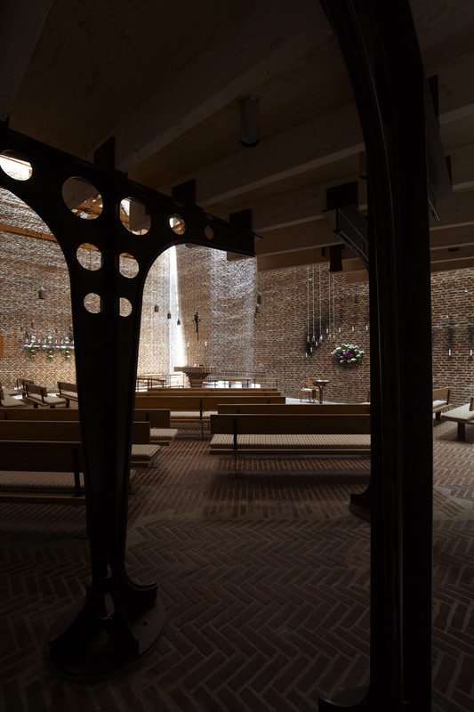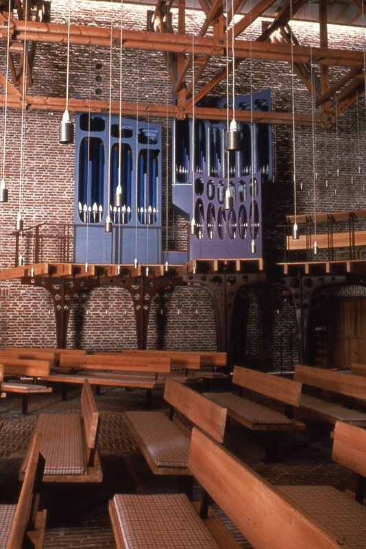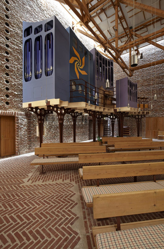 Indgangen til rummet sker gennem en “skov” af buede stålsøjler, der bærer orgelpulpituret.