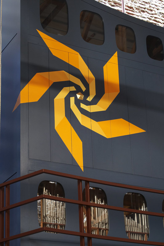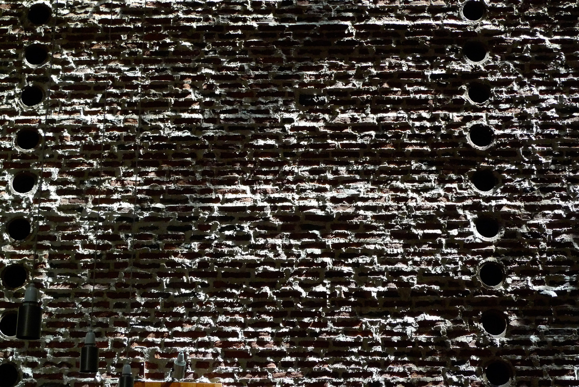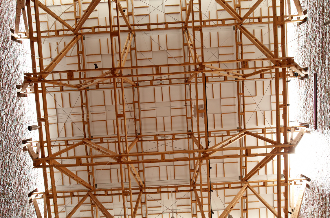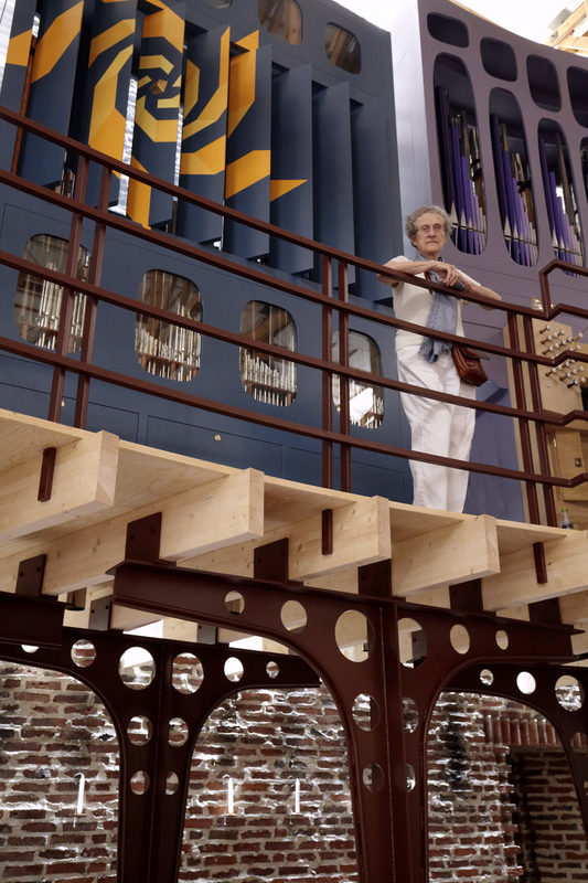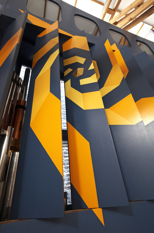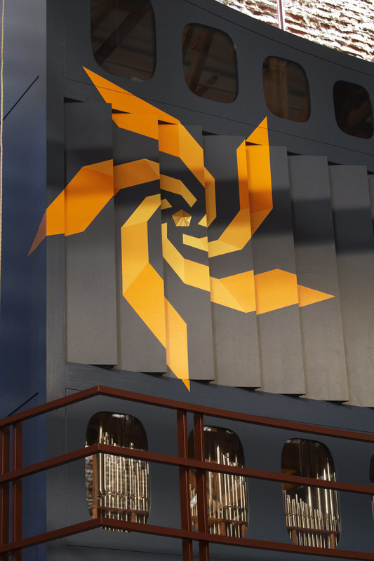 Indgangen til rummet sker gennem en “skov” af buede stålsøjler, der bærer orgelpulpituret.