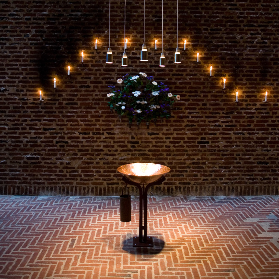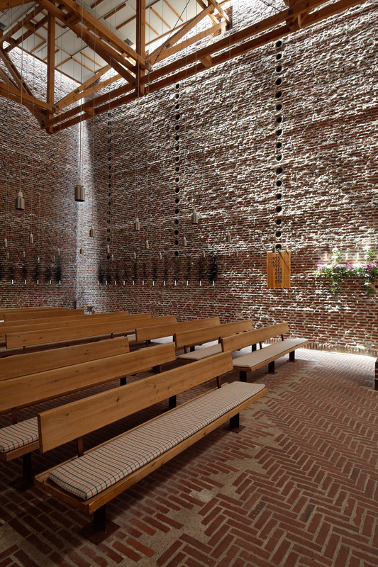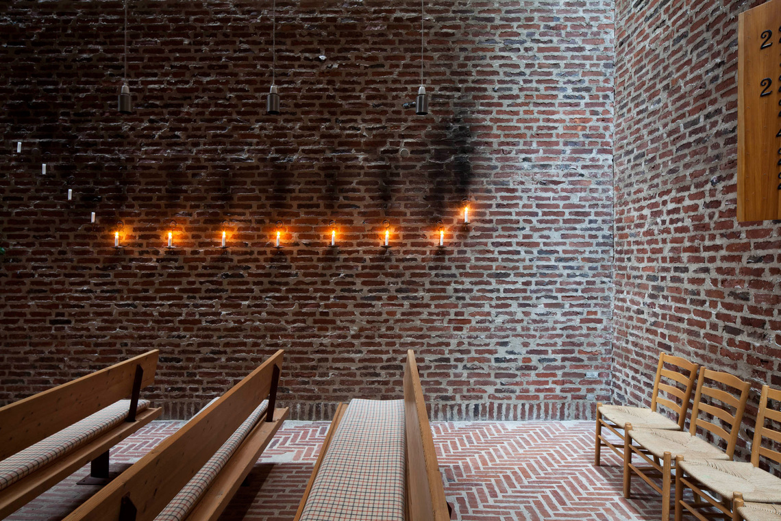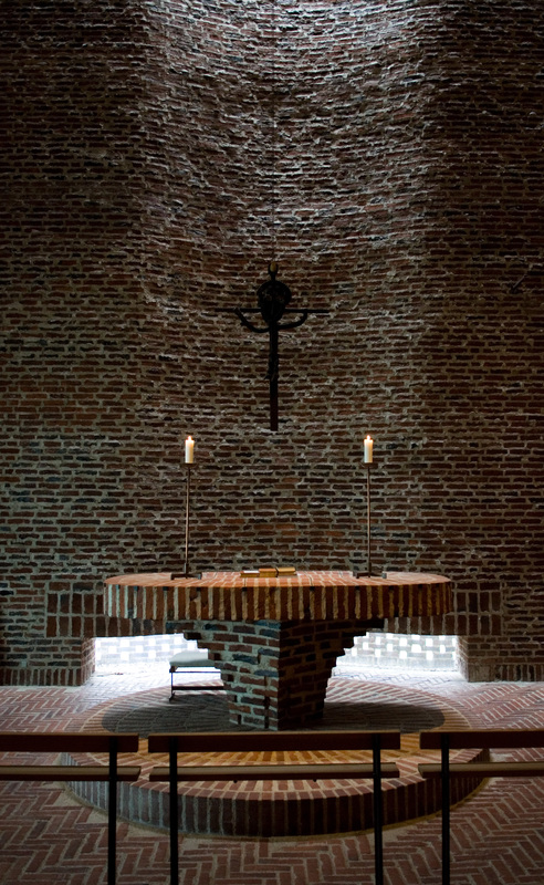 I Islev Kirke er interiørets dunkle stemning og skønheden i det svagt belyste rum dyrket, inspireret af de romanske kirker.
