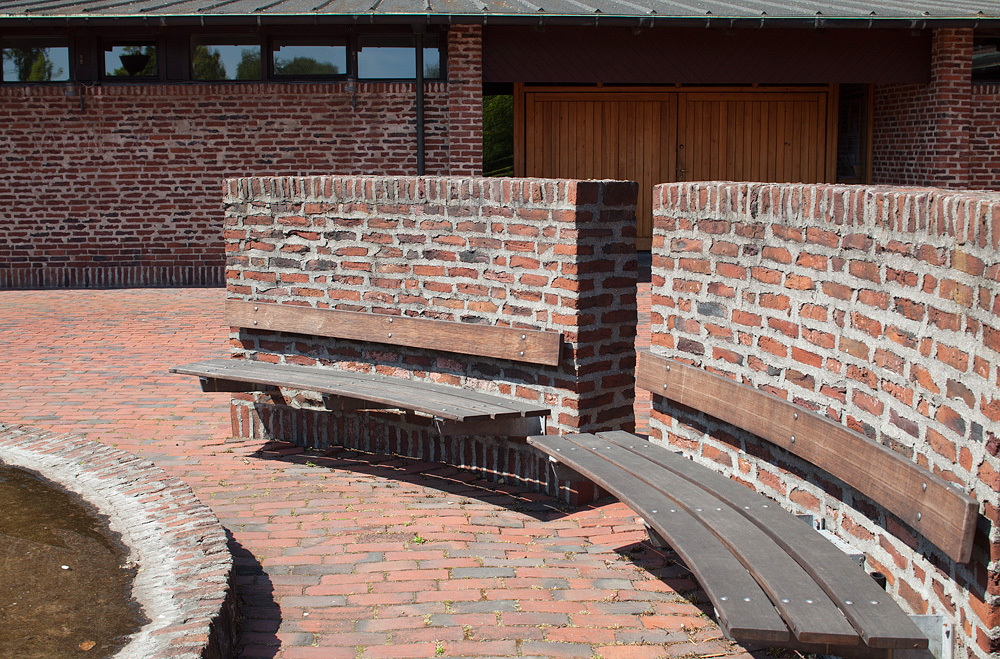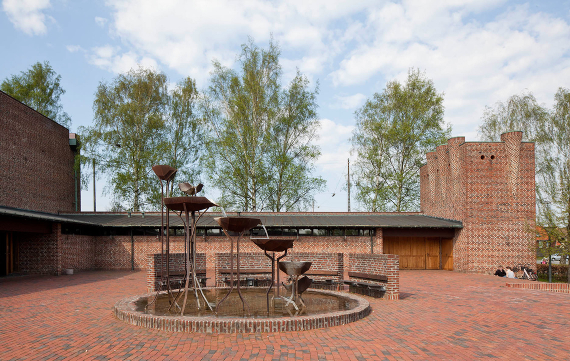 På kirkepladsen er opstillet en vandkunst med kar af corten stål.