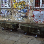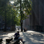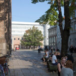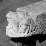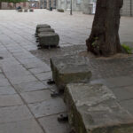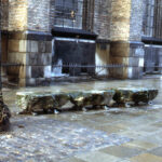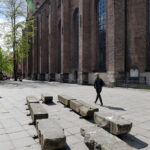 De kasserede sandstenskonsoller fra Rundetårn er genbrugt og opstillet på Trinitatis Kirkeplads som siddeskulpturer.