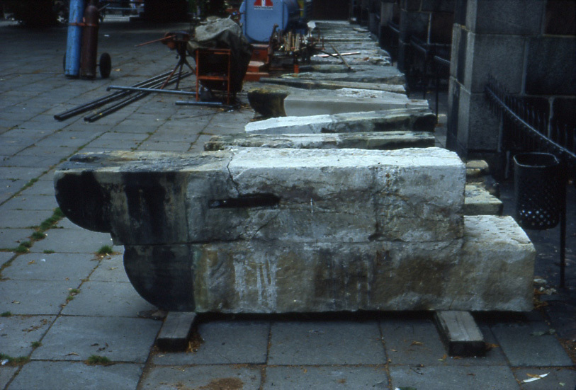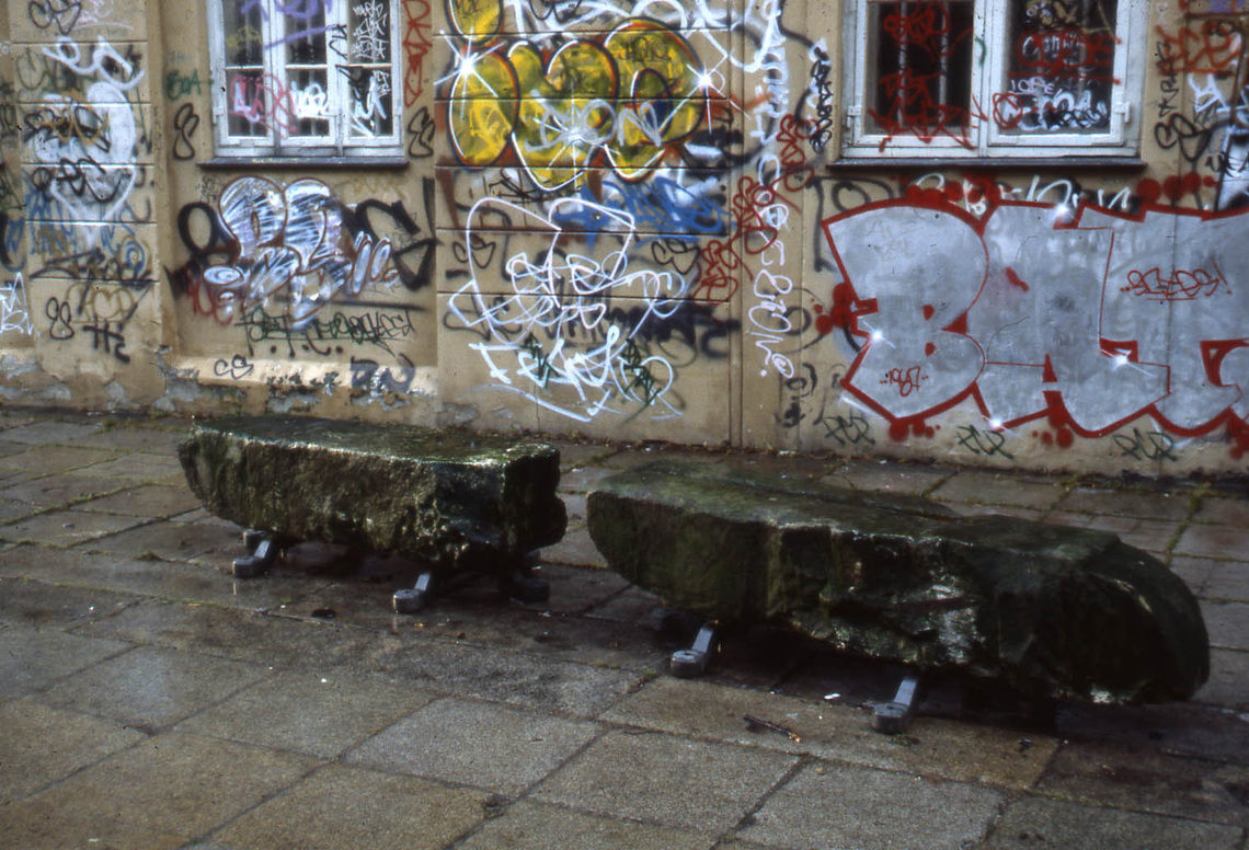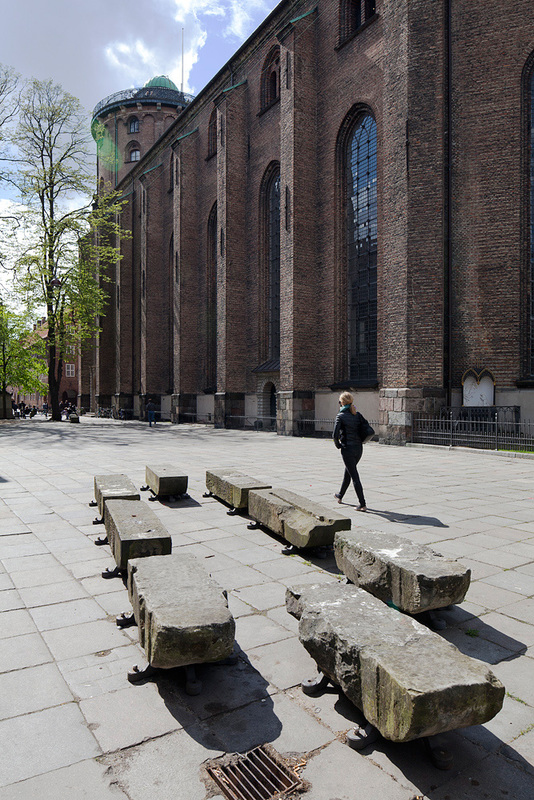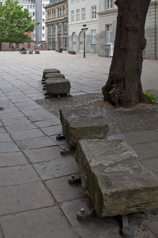 De kasserede sandstenskonsoller fra Rundetårn er genbrugt og opstillet på Trinitatis Kirkeplads som siddeskulpturer.